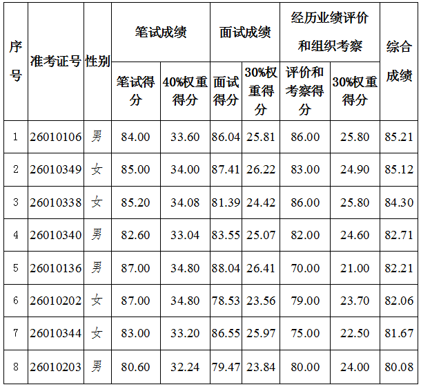 根據(jù)《中共文山州委州直機(jī)關(guān)工委關(guān)于公開(kāi)選調(diào)黨員(職工)服務(wù)中心人員工作方案》和《中共文山州委州直機(jī)關(guān)工委2019年公開(kāi)選調(diào)黨員(職工)服務(wù)中心人員公告》有關(guān)程序和規(guī)定,經(jīng)過(guò)筆試、面試、體檢、經(jīng)歷業(yè)績(jī)?cè)u(píng)價(jià)和組織考察等環(huán)節(jié),現(xiàn)將進(jìn)入最后一個(gè)環(huán)節(jié)的8名考生綜合成績(jī)公布如下:
