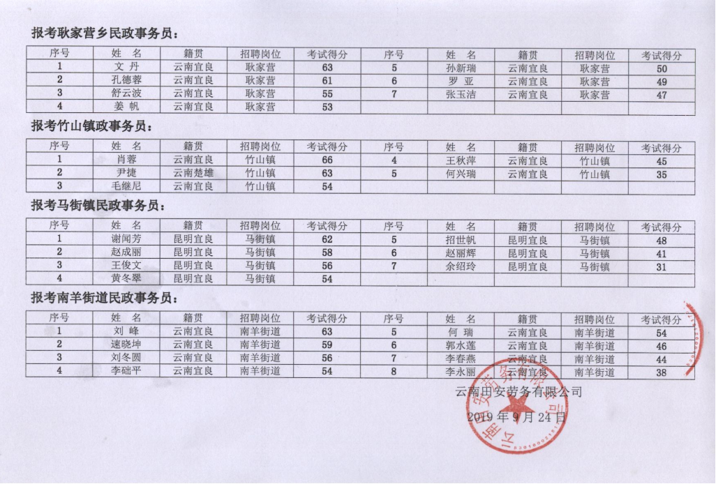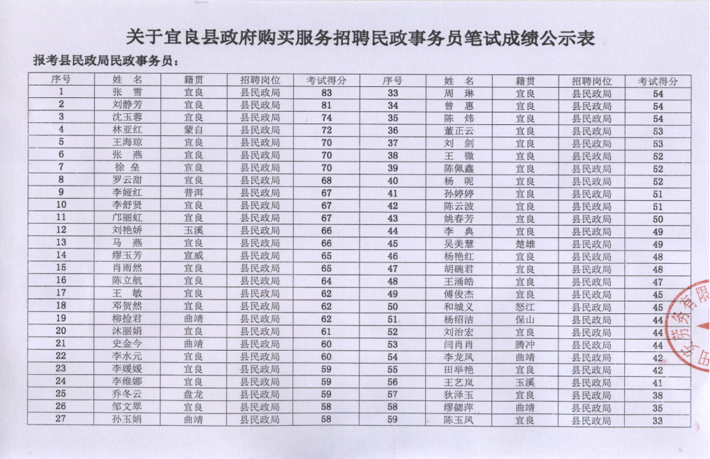 宜良縣政府購買服務(wù)招聘民政事務(wù)員筆試成績公示表