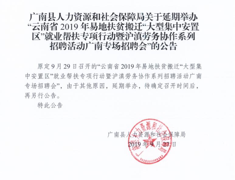 2019年文山州廣南縣人力資源和社會保障局舉辦專場招聘會延期舉辦的公告