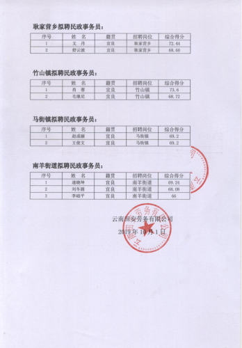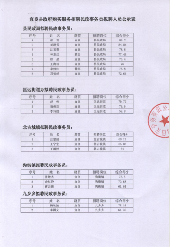 宜良縣政府購買服務招聘民政事務員擬聘人員公示
