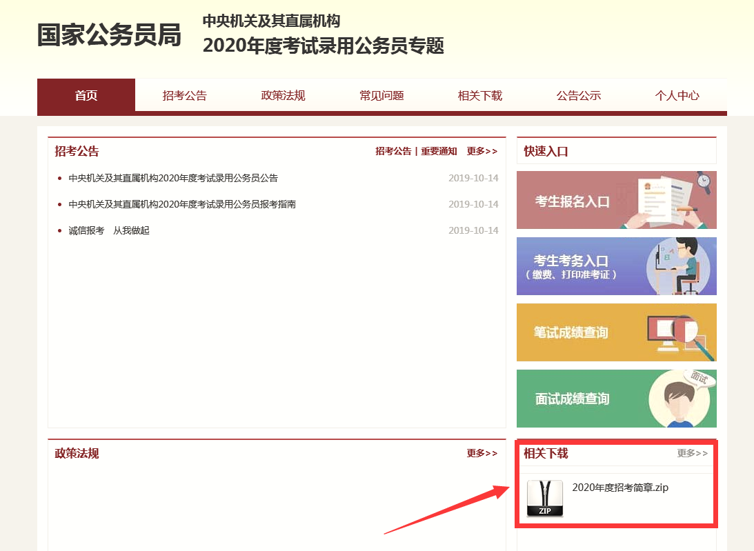 中央機關(guān)及其直屬機構(gòu)2020年度考試錄用公務(wù)員專題網(wǎng)站下載,進入之后點擊頁面右面的“相關(guān)下載”,點擊“2020年度招考簡章.zip”即可下載,如下圖: