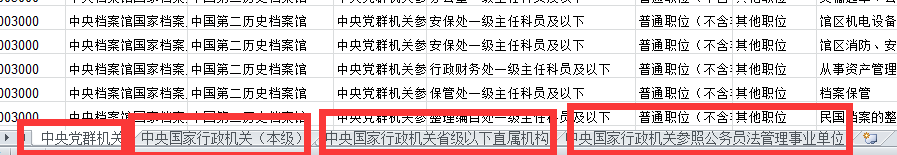 點擊下載后為“.zip”的壓縮文件,請確保你的電腦已經(jīng)安裝解壓縮軟件,否則無法解壓,解壓文件后得到“2020年度招考簡章.xls”的MS-office表格文件,請確保你的電腦已經(jīng)安裝“MS-office辦公軟件”,否則打開的將是亂碼,打開表格文件后可查閱到“中央黨群機關(guān)”“中央國家行政機關(guān)(本級)”“中央國家行政機關(guān)省級以下直屬機構(gòu)”“中央國家行政機關(guān)參照公務(wù)員法管理事業(yè)單位”四張表格,請注意表格左下角不同表格之間的切換,如下圖所示: