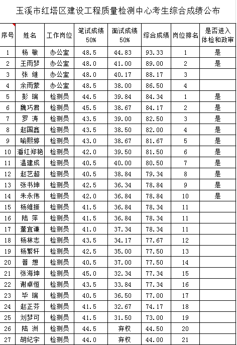 玉溪市紅塔區(qū)建設(shè)工程質(zhì)量檢測中心考生綜合成績公布