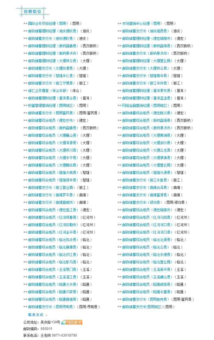 (二)曲靖分公司:郵政儲(chǔ)蓄支行長(zhǎng)4名(宣威市1名、富源縣1名、羅平縣1名、會(huì)澤縣1名)。