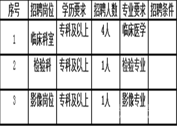 根據(jù)《云南省事業(yè)單位公開(kāi)招聘工作人員辦法》(云人社發(fā)〔2016〕182號(hào))等有關(guān)文件規(guī)定,經(jīng)院領(lǐng)導(dǎo)班子討論決定,2019年縣醫(yī)院面向社會(huì)公開(kāi)招聘6名編外人員,現(xiàn)將有關(guān)招聘事宜公告如下: