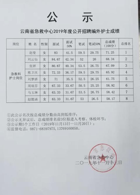 云南省急救中心2019年度公開招聘編外護(hù)士成績公示