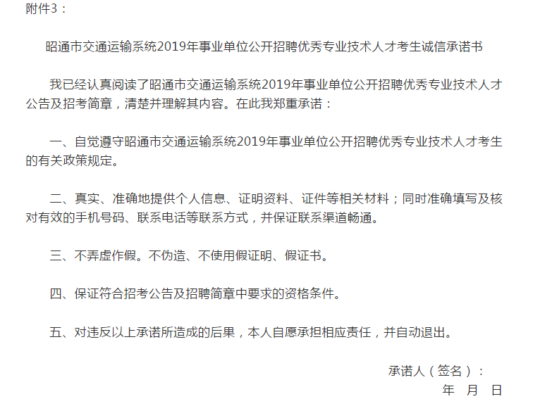 3.昭通市交通運輸系統(tǒng)2019年事業(yè)單位公開招聘優(yōu)秀專業(yè)技術(shù)人才考生誠信承諾書