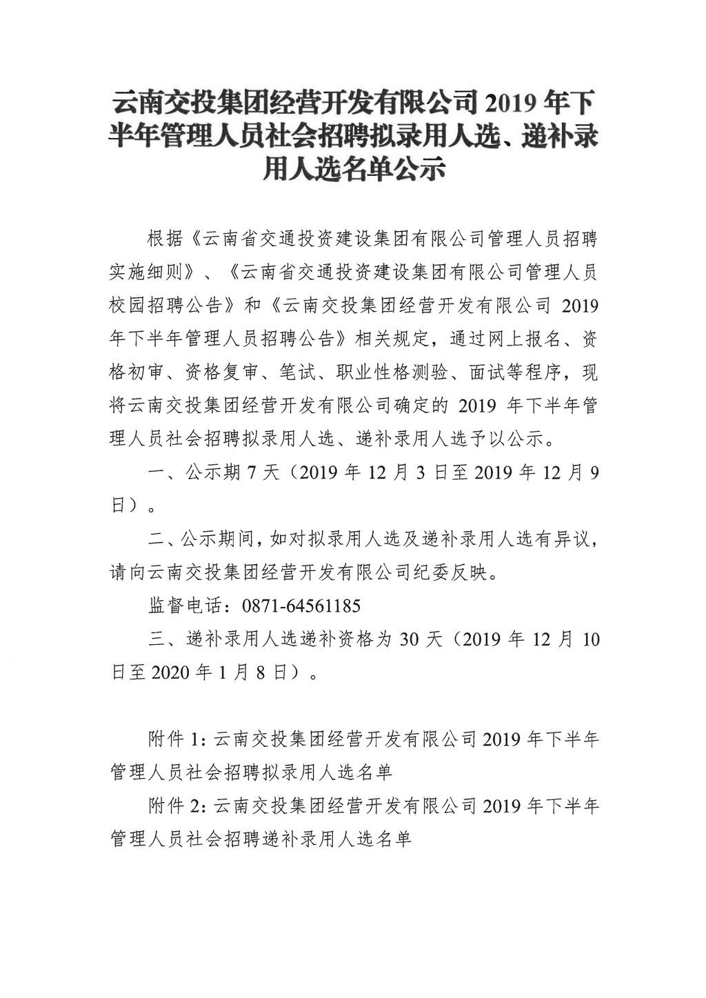 點(diǎn)擊查看:云南交投集團(tuán)經(jīng)營(yíng)開發(fā)有限公司2019年下半年管理人員杜會(huì)招聘擬錄用人選、遞補(bǔ)錄用人選名單