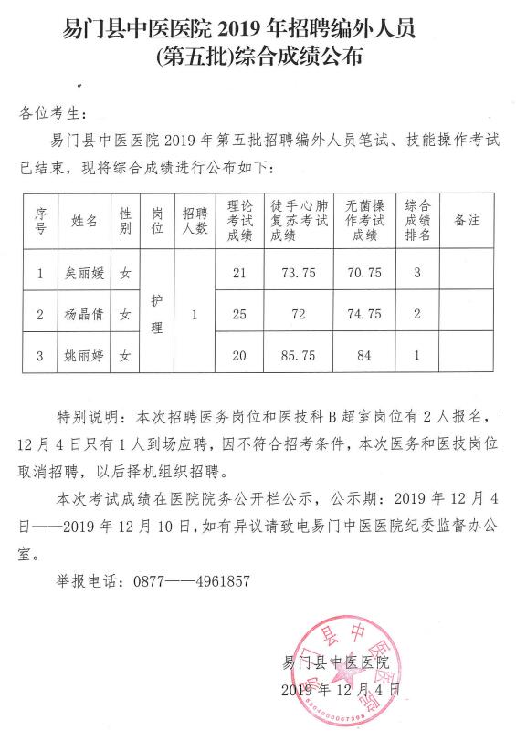 易門縣中醫(yī)醫(yī)院2019年招聘編外人員(第五批)綜合成績公布