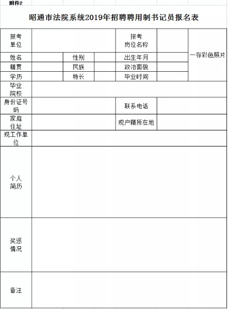 2、《昭通市法院系統(tǒng)2019年招聘聘用制書記員報(bào)名表》。