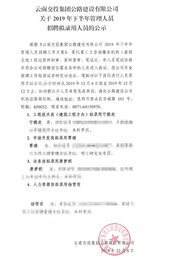 云南交投集團(tuán)公路建設(shè)有限公司關(guān)于2019年下半年管理人員 招聘擬錄用人員的公示