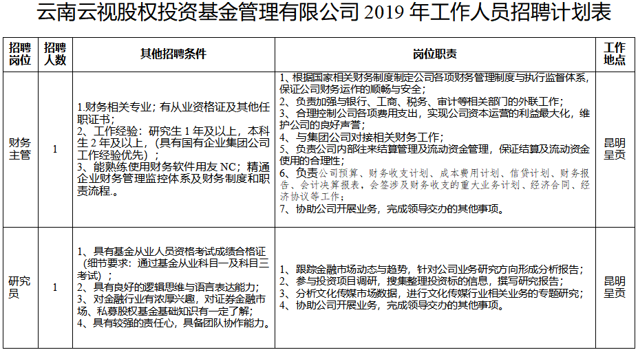 詳見《云南云視股權(quán)投資基金管理有限公司2019年工作人員招聘計(jì)劃表》。