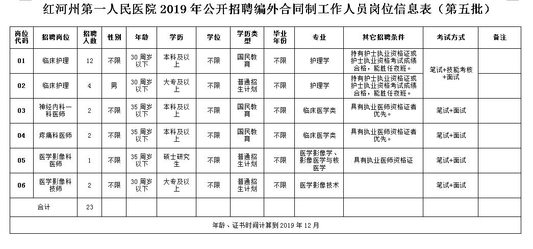 本次招聘編外合同制工作人員23人,具體崗位見《紅河州第一人民醫(yī)院2019年公開招聘編外合同制工作人員崗位信息表(第五批)》