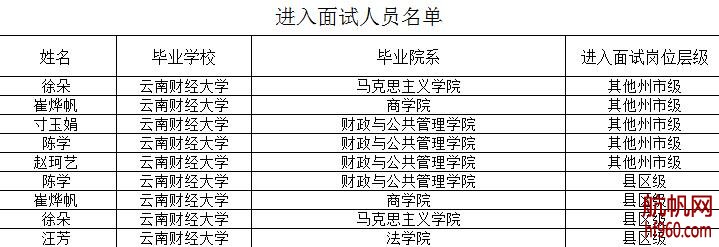 按照云南省面向各選定高校招錄2020年定向選調(diào)生公告,經(jīng)筆試,確定進(jìn)入云南省2020年定向選調(diào)生面試人員名單,現(xiàn)將面試有關(guān)事項(xiàng)公告如下: