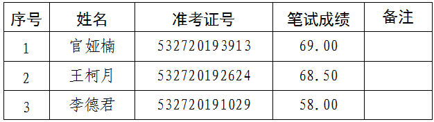根據(jù)《普洱市衛(wèi)生健康委員會2019年公開遴選參照公務(wù)員法管理單位工作人員公告》(第1號),普洱市委組織部和市人社局于2019年12月7日統(tǒng)一組織開展了“衛(wèi)生健康監(jiān)督執(zhí)法崗職位(職位代碼B005001)”公開遴選的筆試工作。現(xiàn)將有關(guān)事項公告如下: