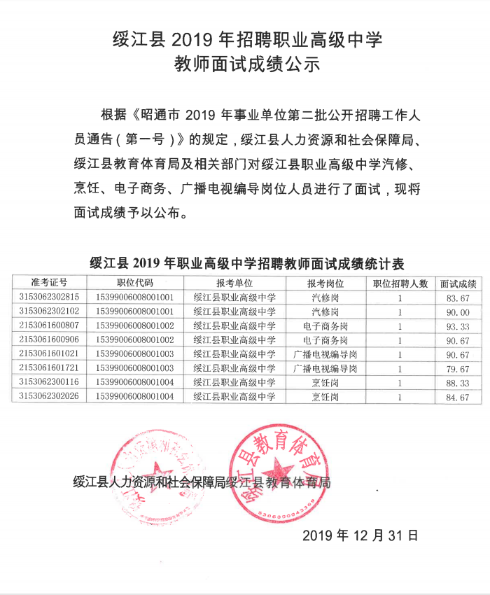 綏江縣2019年招聘職業(yè)高級(jí)中學(xué)教師面試成績(jī)公示