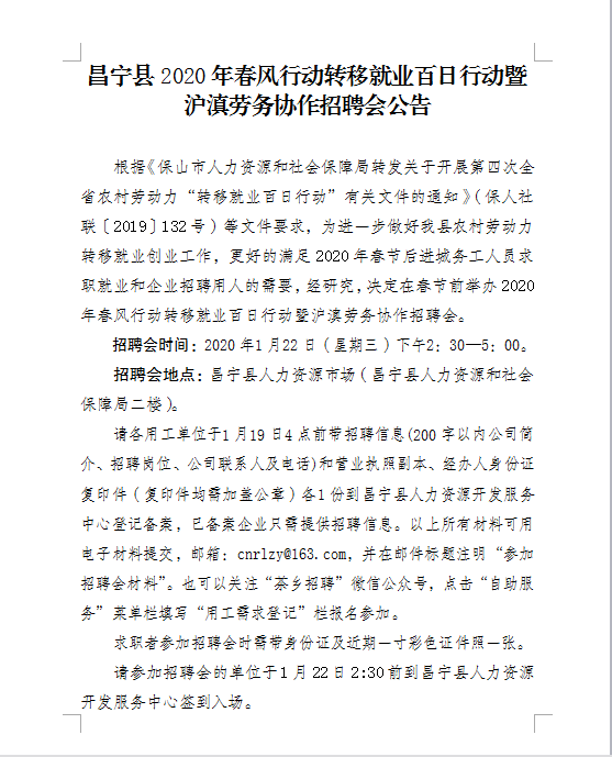 昌寧縣2020年春風(fēng)行動(dòng)轉(zhuǎn)移就業(yè)百日行動(dòng)暨滬滇勞務(wù)協(xié)作招聘會(huì)公告