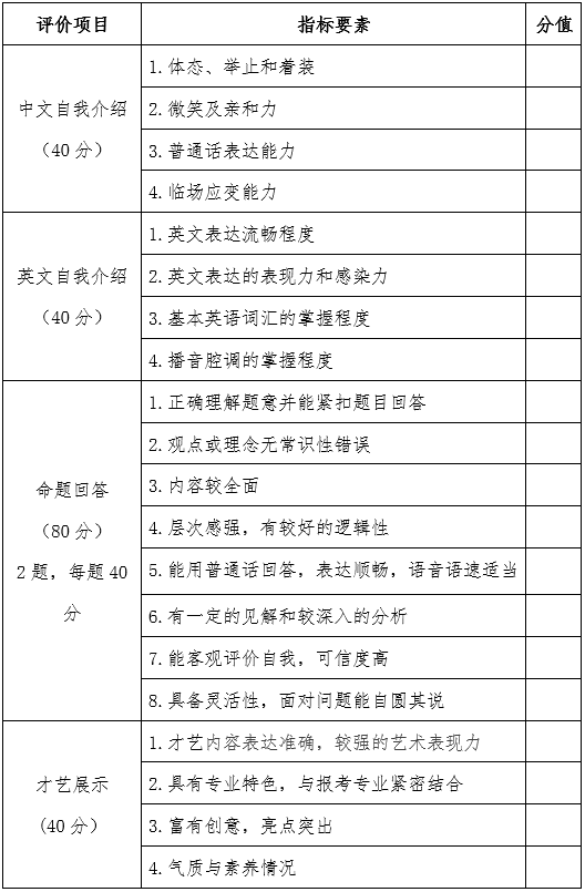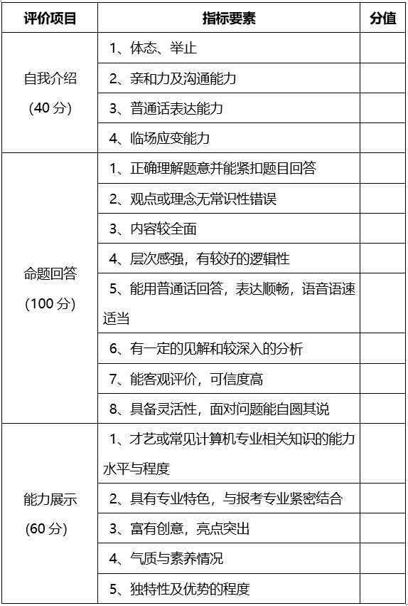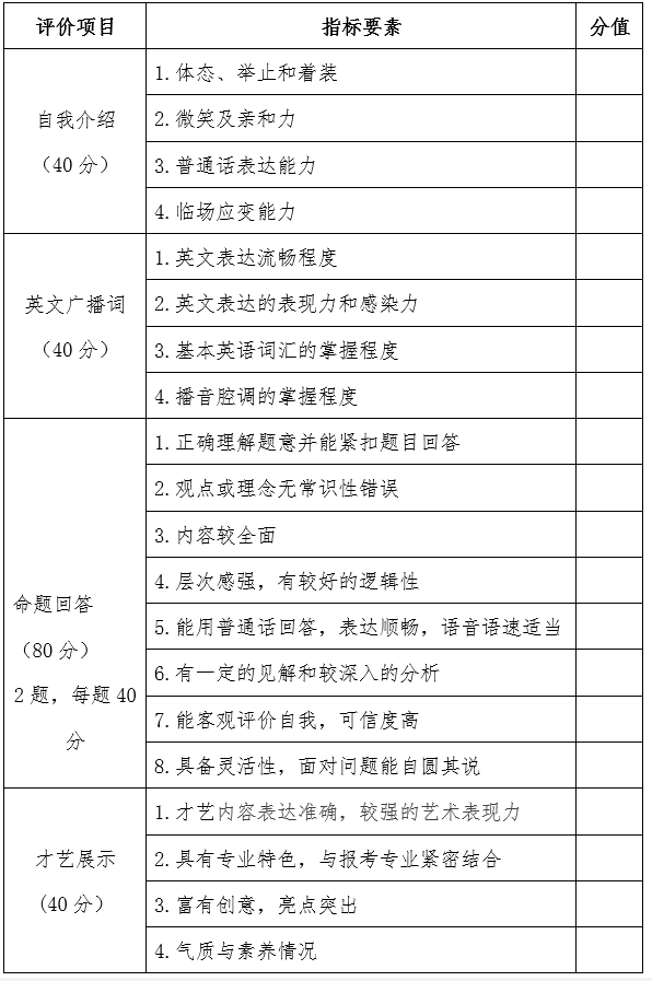 (1)自我介紹(40分):考生使用普通話或英語進(jìn)行不超過3分鐘的自我介紹,考查學(xué)生的體態(tài)、舉止、溝通能力、普通話或英語口語表達(dá)能力及應(yīng)變能力。