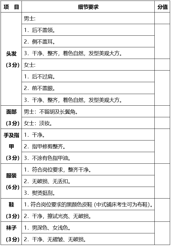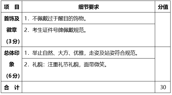 (1)儀容儀表(30分):考生根據(jù)考官口令,在1分鐘內(nèi)展示考生衣著、儀表、舉止、五官、姿態(tài)、肢體表達(dá)等;