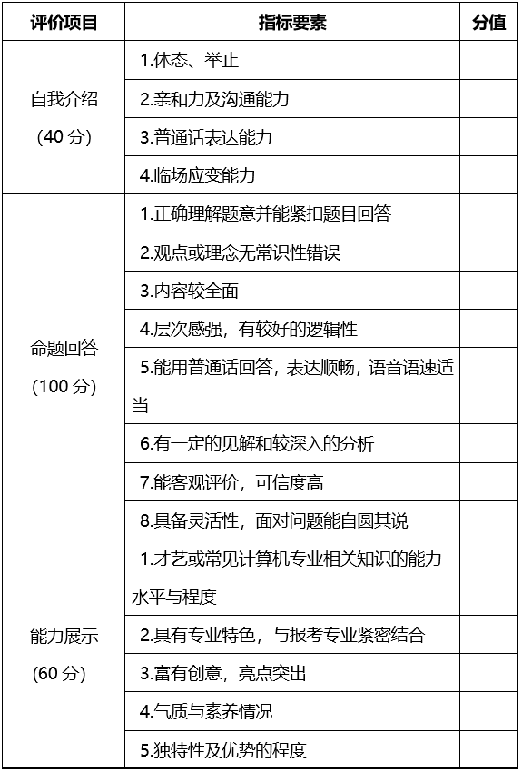 (2)自我介紹(20分):考生使用普通話或英語進(jìn)行不超過1分鐘的自我介紹,考查學(xué)生的普通話或英語表達(dá)能力、語言組織能力、邏輯思維能力和臨場(chǎng)應(yīng)變能力;