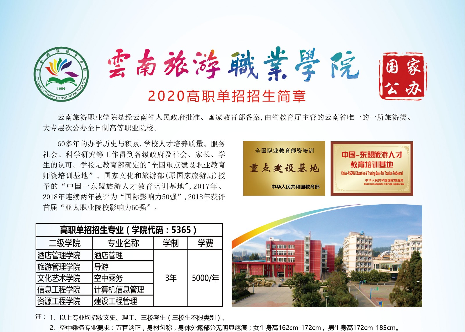云南旅游職業(yè)學院2020高職單招招生簡章