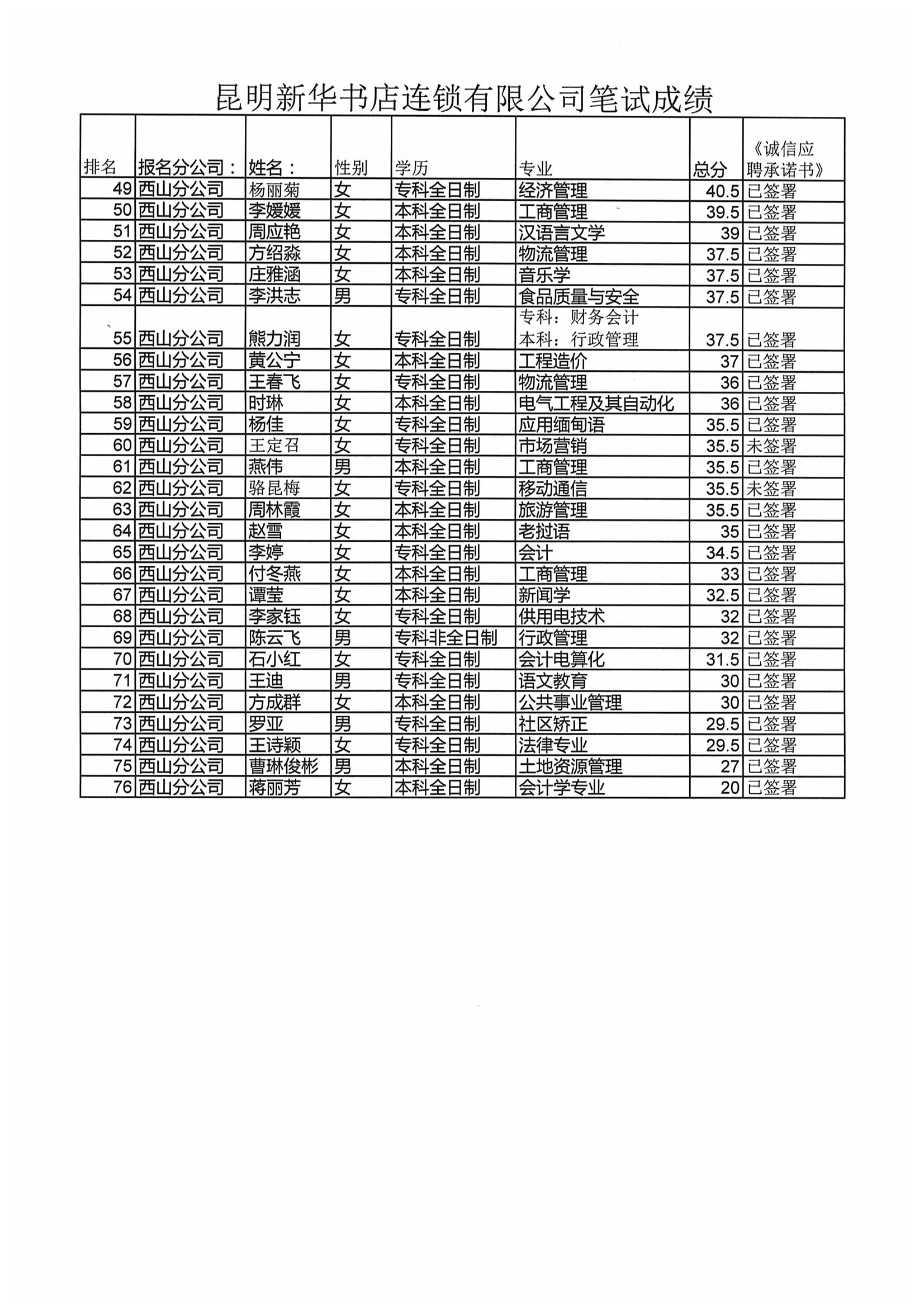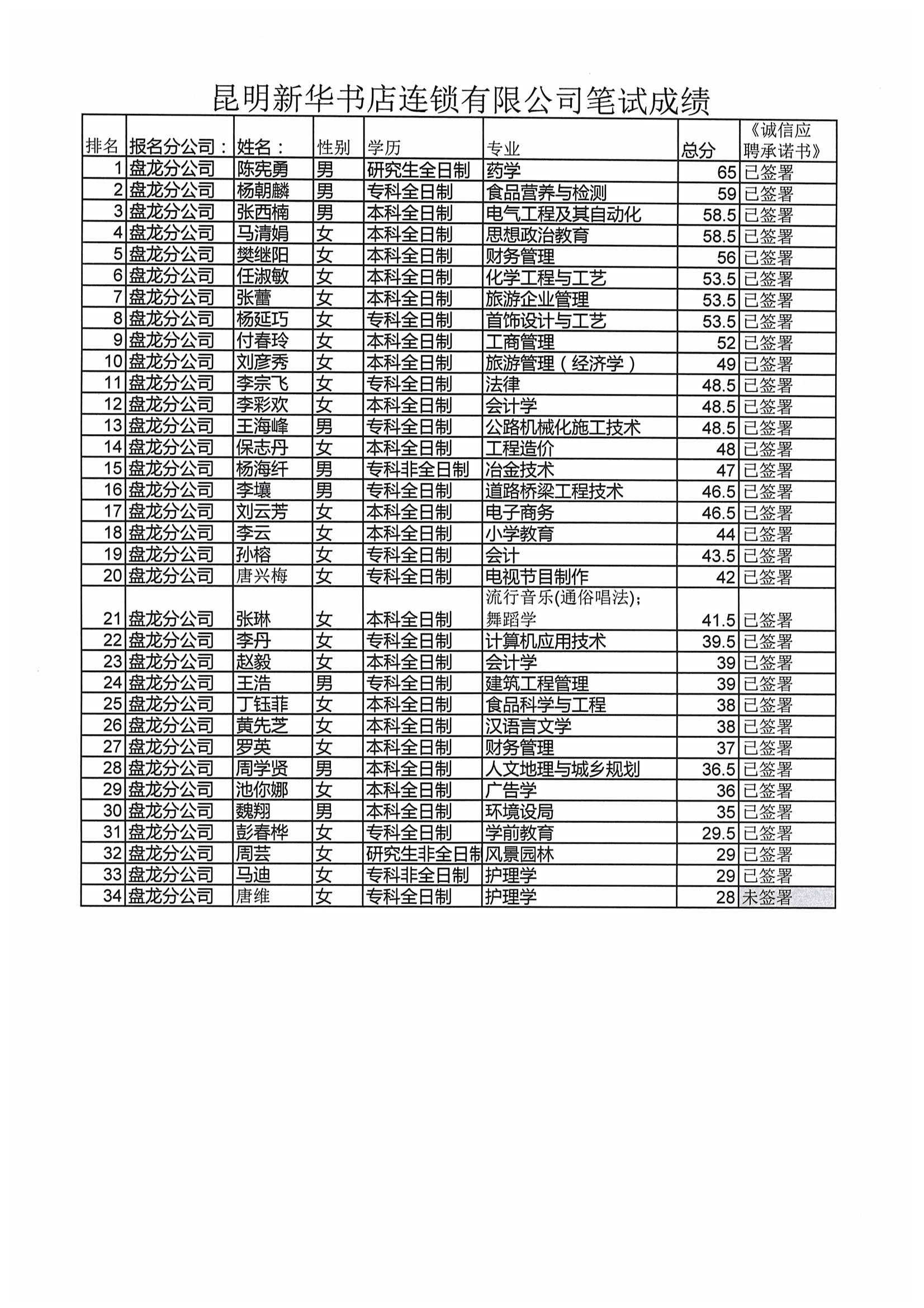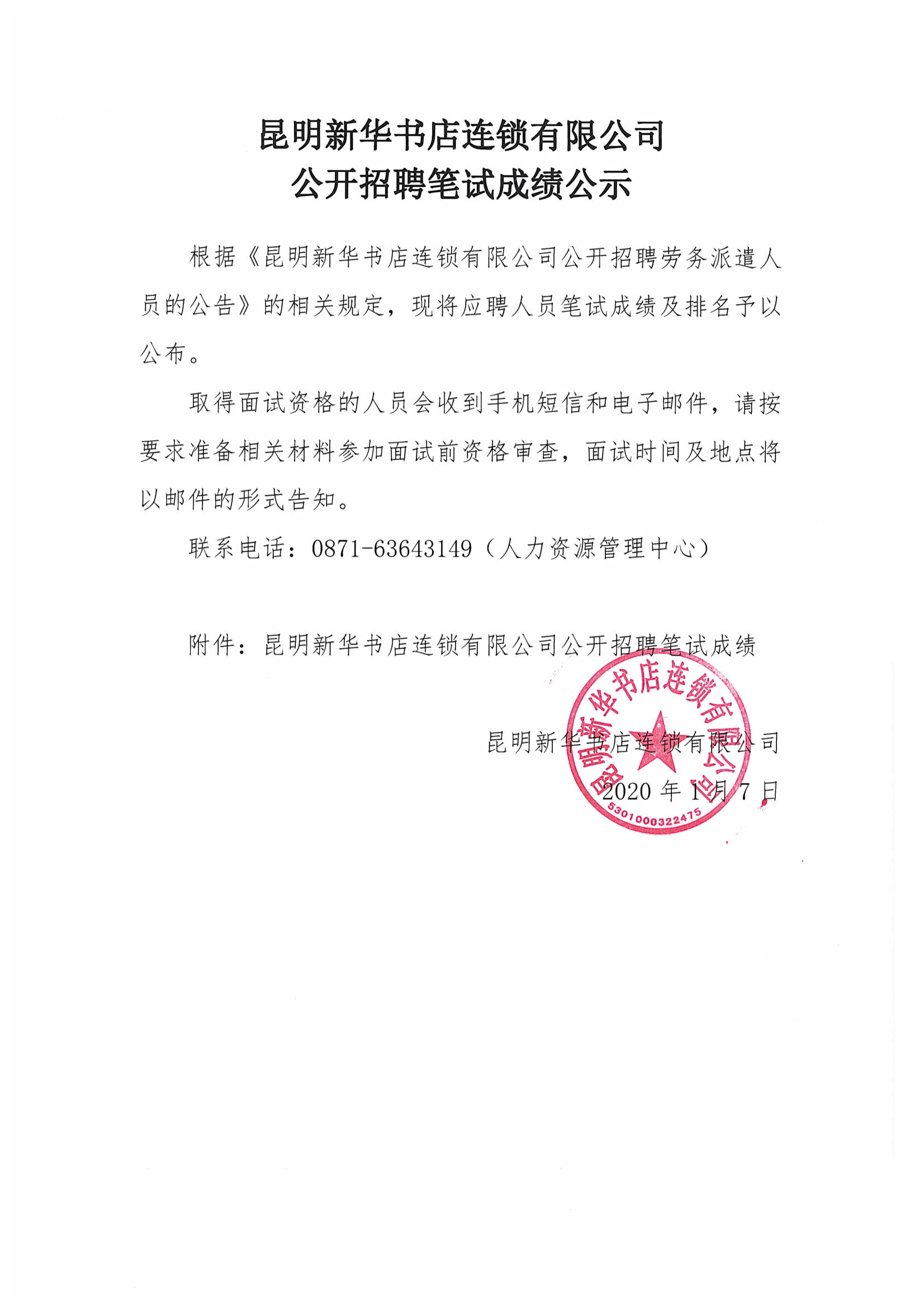 昆明新華書(shū)店連鎖有限公司公開(kāi)招聘筆試成績(jī)公示