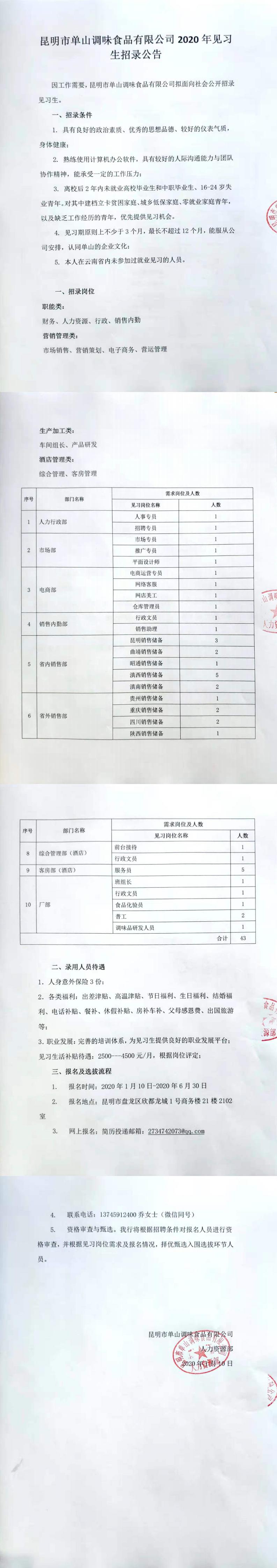 昆明市單山調(diào)味食品有限公司2020年見(jiàn)習(xí)生招錄公告