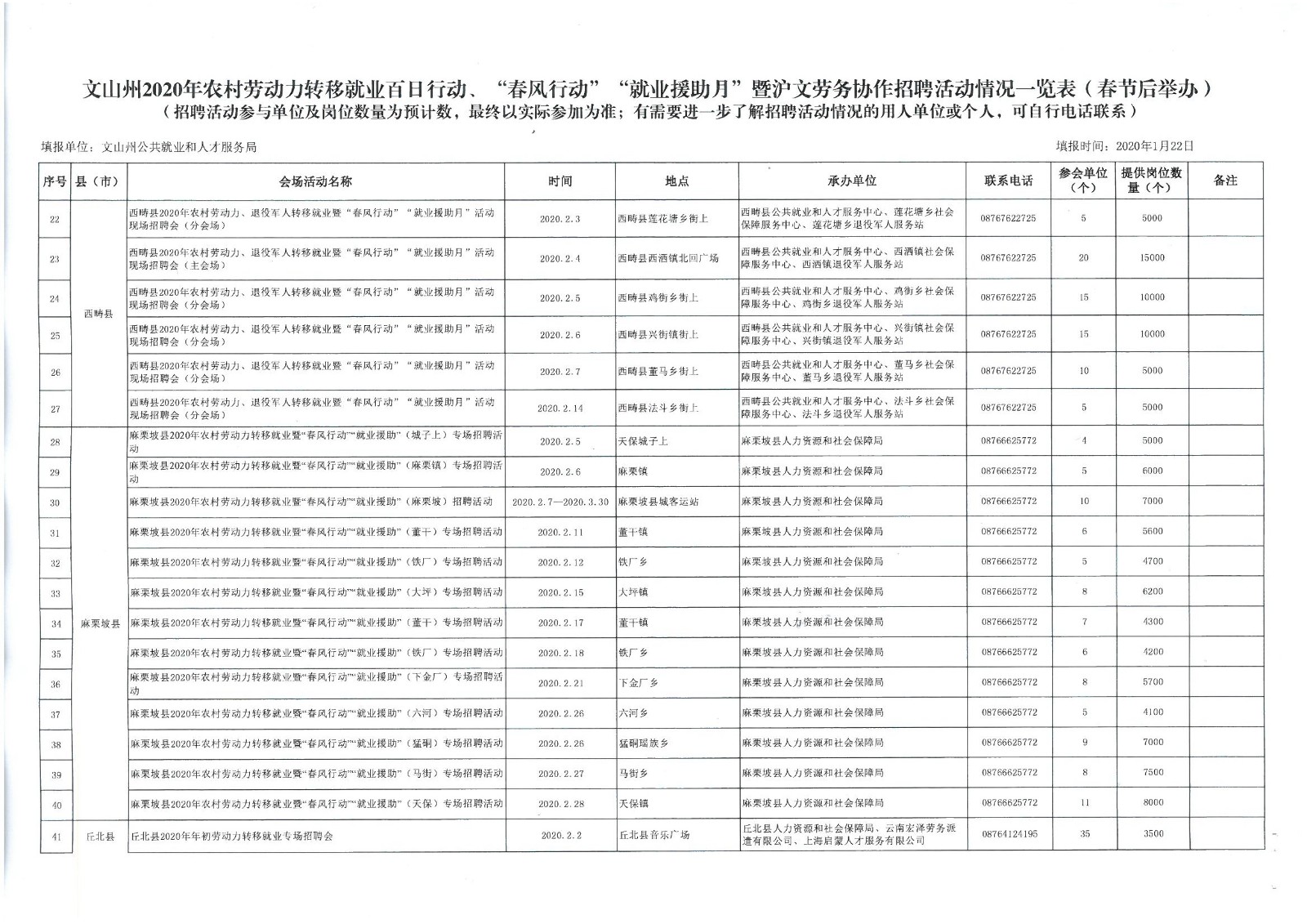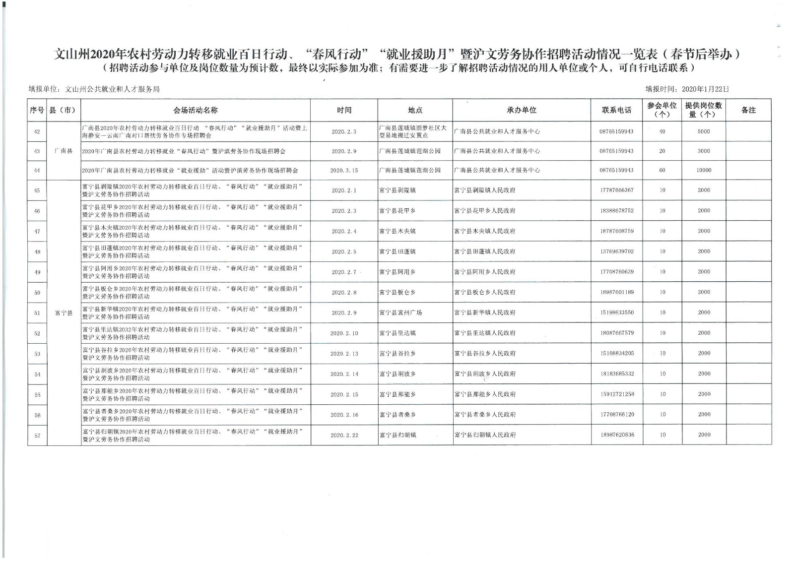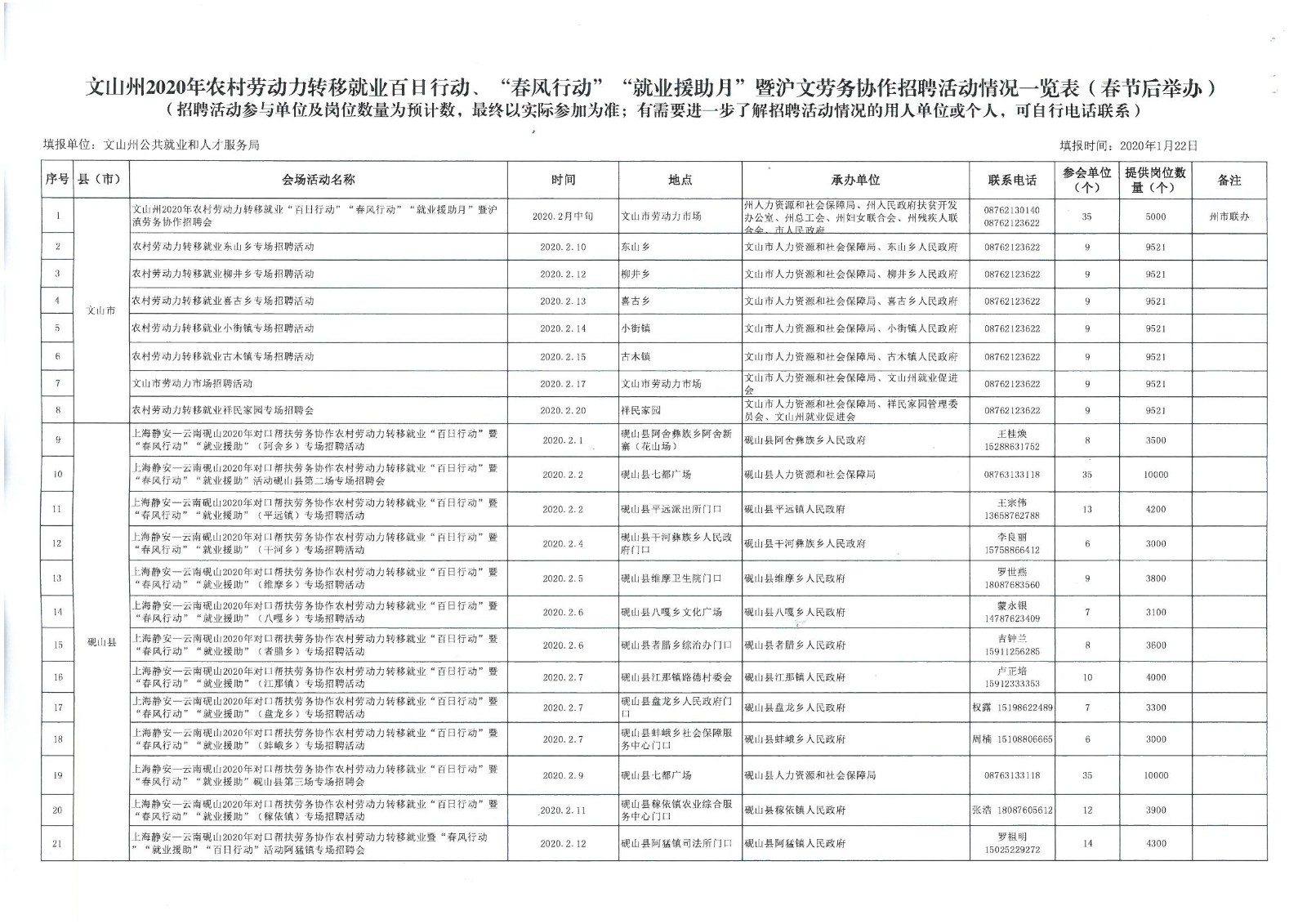 文山州2020年農村勞動力轉移就業(yè)、“春風行動”“就業(yè)援助月”暨滬文勞務協(xié)作招聘會情況一覽表 .xls