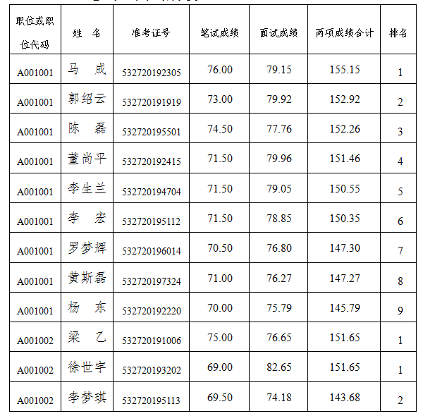 注:若考生對本人成績有異議,可于2020年2月17日前向中共普洱市委辦公室提出查分申請。由中共普洱市委辦公室委托受邀對本次遴選工作進(jìn)行監(jiān)督的市紀(jì)委市監(jiān)委駐市委辦公室紀(jì)檢監(jiān)察組組長進(jìn)行查分,并將結(jié)果告知。