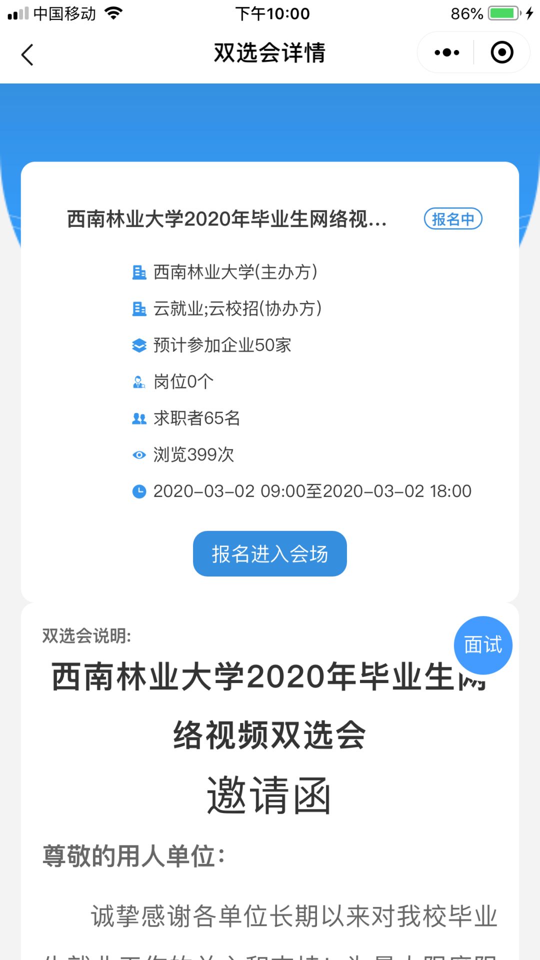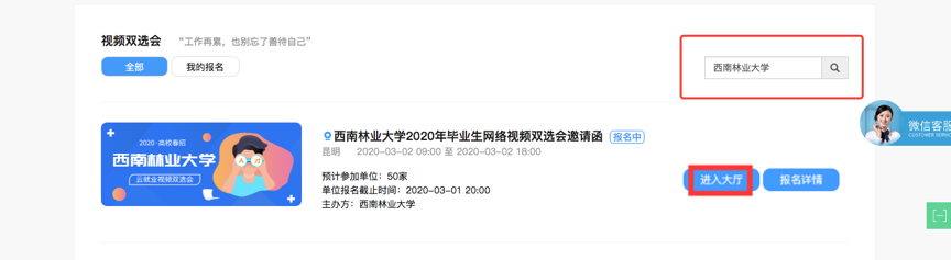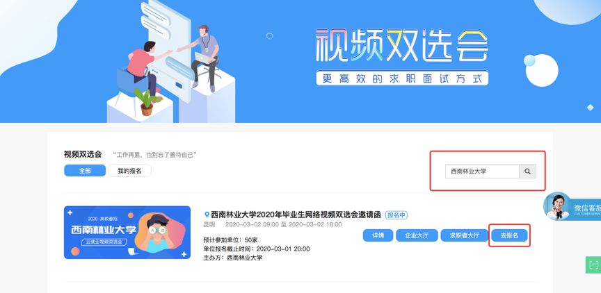 進入小程序后,點擊“雙選會”選擇“云就業(yè)視頻雙選會”搜索-西南林業(yè)大學2020年畢業(yè)生網絡視頻雙選會,進入后可點擊“報名進入會場”進行報名,提前了解單位和各崗位信息。