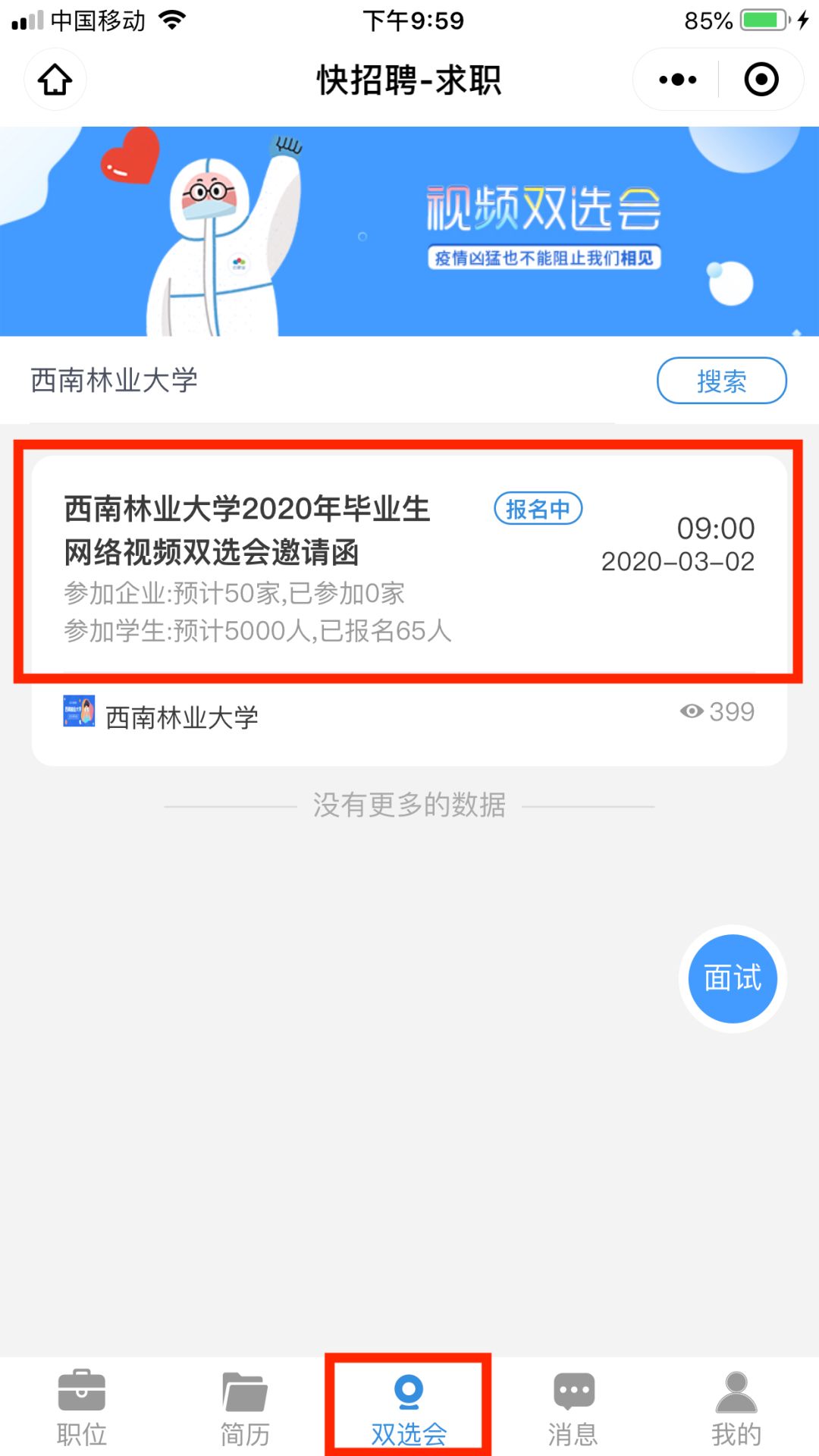 2、搜索西南林業(yè)大學,選擇需要參加的視頻雙選會場次,了解詳情