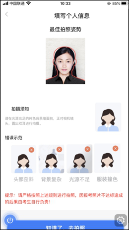 可以通過手機(jī)拍照或者上傳方式提交照片,系統(tǒng)會(huì)自動(dòng)裁剪編輯照片背景色,請考生在單色背景下拍照,按照系統(tǒng)提示擺好姿勢拍照,因照片不合格造成的報(bào)名不成功由考生自行承擔(dān)后果。