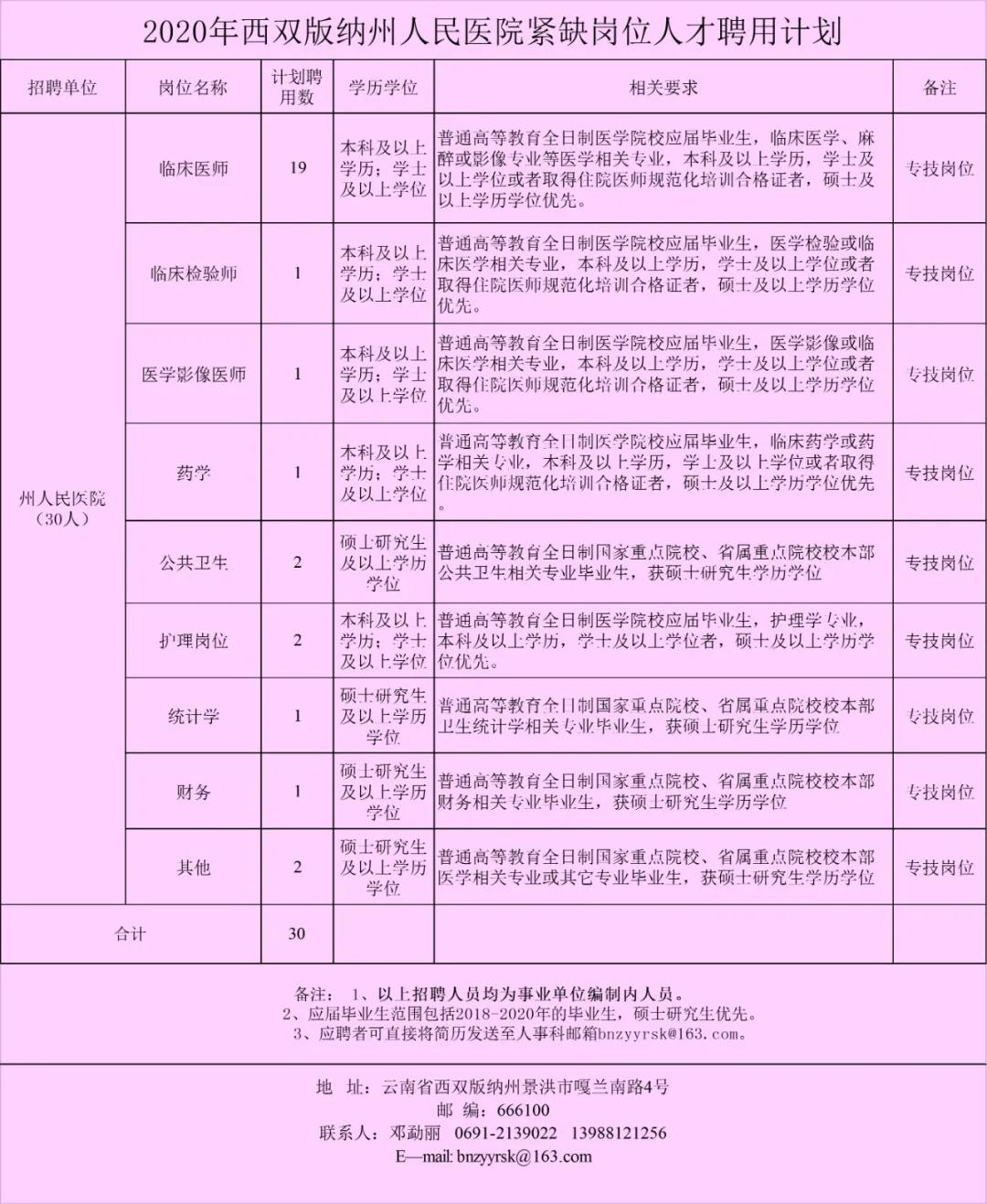 西雙版納州人民醫(yī)院2020年緊缺崗位人才引進招聘計劃