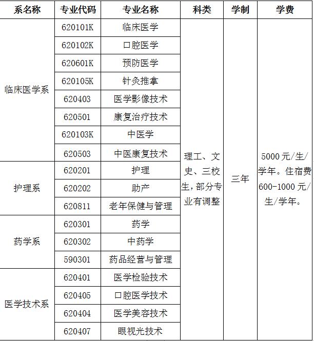 學(xué)院與省內(nèi)外100家醫(yī)院和醫(yī)藥衛(wèi)生機(jī)構(gòu)建立了校外教學(xué)基地,其中附屬醫(yī)院1所、非直屬附屬醫(yī)院2所、教學(xué)醫(yī)院15所,25所實(shí)習(xí)醫(yī)院?,F(xiàn)開(kāi)設(shè)有臨床醫(yī)學(xué)、口腔醫(yī)學(xué)、預(yù)防醫(yī)學(xué)、中醫(yī)學(xué)、針灸推拿、護(hù)理、助產(chǎn)、藥學(xué)、中藥學(xué)、醫(yī)學(xué)檢驗(yàn)技術(shù)、醫(yī)學(xué)影像技術(shù)、康復(fù)治療技術(shù)、眼視光技術(shù)、口腔醫(yī)學(xué)技術(shù)、中醫(yī)康復(fù)技術(shù)、藥品經(jīng)營(yíng)與管理、老年保健與管理、醫(yī)學(xué)美容技術(shù)18個(gè)大專(zhuān)專(zhuān)業(yè)。
