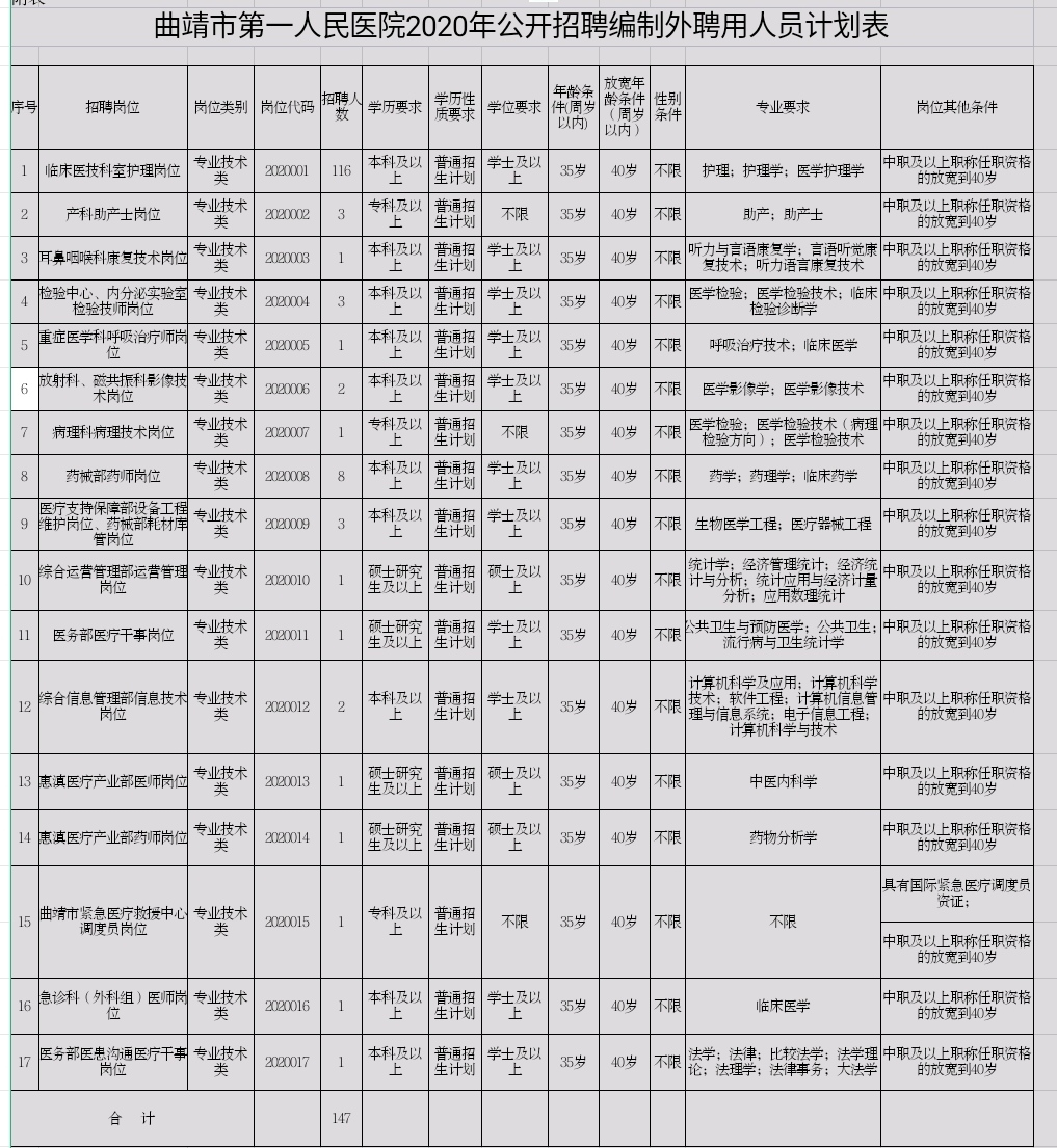 (二)招聘范圍及對(duì)象:詳見(jiàn)《曲靖市第一人民醫(yī)院2020年公開(kāi)招聘編制外聘用人員計(jì)劃表》。