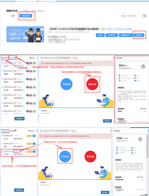 視頻招聘會當(dāng)天,求職者可以自主申請面試,建議用人單位在開始前半小時進(jìn)入面試間,先點擊頁面設(shè)備調(diào)試,查看麥克風(fēng)和攝像頭是否正常(請使用谷歌瀏覽器,面試只能通過視頻,需要配備攝像頭以及麥克風(fēng)),同時預(yù)先處理求職者的面試申請信息。招聘會開始后,可以針對“待面試”列表中的“在線”求職者發(fā)起視頻邀約,也可以直接接收求職者發(fā)起的面試邀約。