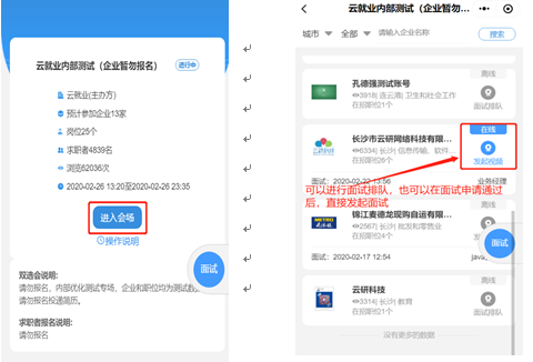 出現(xiàn)在“待面試”列表的內(nèi)容,表明用人單位已經(jīng)同意進(jìn)行面試,可以點擊詳情自主發(fā)起面試(用人單位在線的狀態(tài)下),也可以等用人單位發(fā)起面試(求職者必須在小程序頁面才能接受到邀請),面試完成后等待接收用人單位后期通知即可。