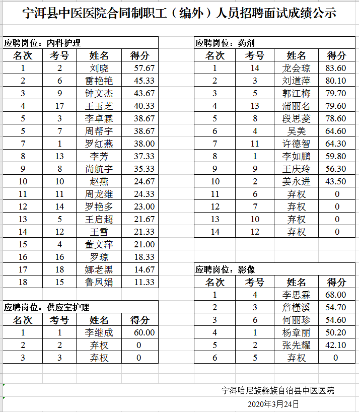 寧洱縣中醫(yī)醫(yī)院合同制職工(編外)人員招聘面試成績(jī)公示