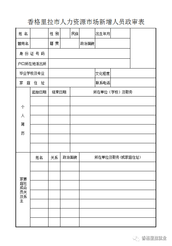 注:《香格里拉市人力資源市場新增人員政審表》由戶籍所在地派出所出具證明
