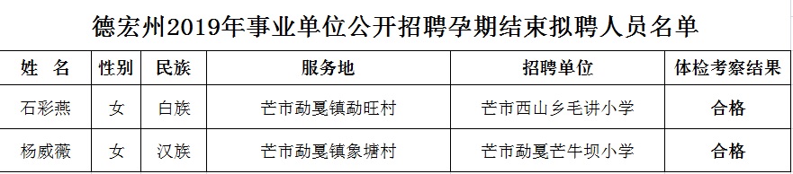 根據(jù)《德宏州2019年事業(yè)單位公開考試招聘工作人員公告》《關(guān)于做好2019年事業(yè)單位定向招聘大學(xué)生村官工作的通知》(德人社發(fā)〔2019〕201號(hào)),經(jīng)筆試、資格審核、體檢、考察合格,現(xiàn)將2019年事業(yè)單位公開考試招聘孕期結(jié)束擬聘人員石彩燕、楊威薇予以公示。公示期為7個(gè)工作日,即2020年4月1日至4月10日(節(jié)假日順延)。