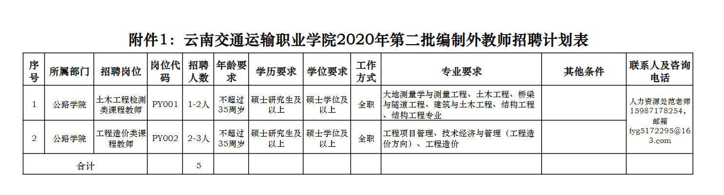 附件1:云南交通運(yùn)輸職業(yè)學(xué)院2020年第二批編制外教師招聘計(jì)劃表