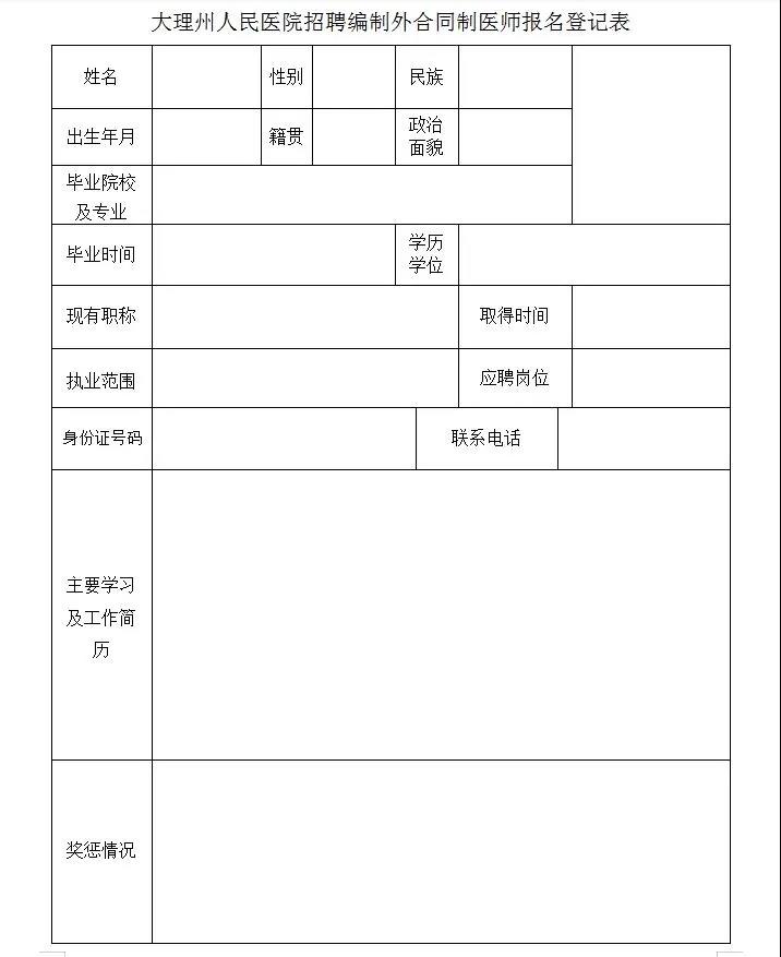 (四)報(bào)名要求:報(bào)名人員請(qǐng)自行下載附件填寫《大理州人民醫(yī)院招聘編制外合同制醫(yī)師報(bào)名登記表》,并按要求提供相關(guān)證件及材料。