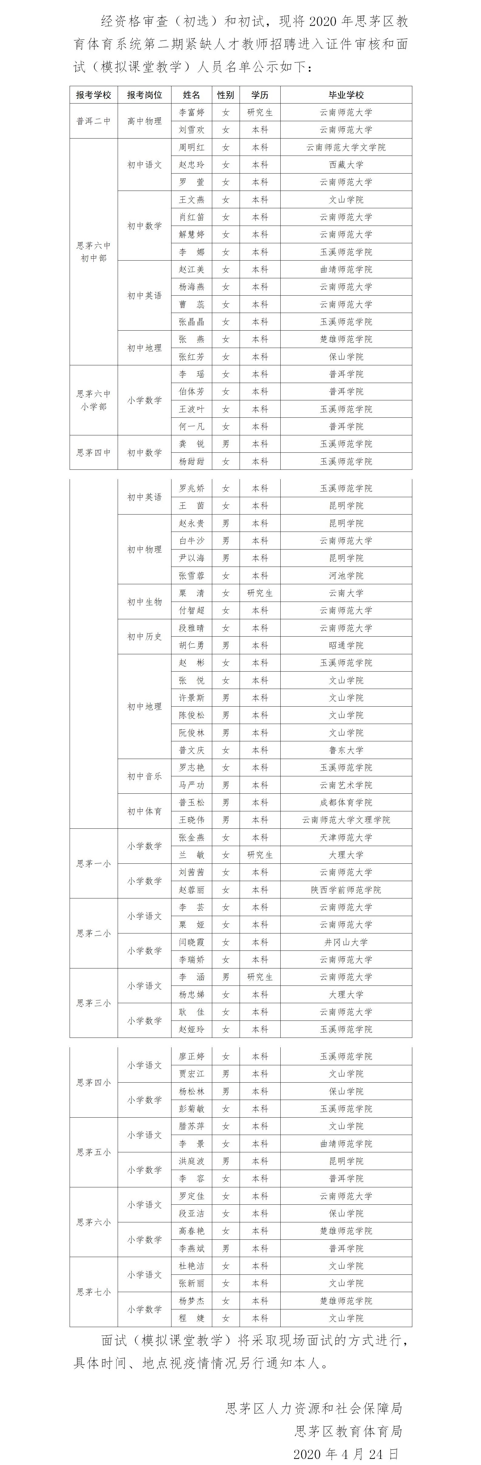 2020年普洱市思茅區(qū)教育體育系統(tǒng)第二期教師招聘進(jìn)入面試名單公示