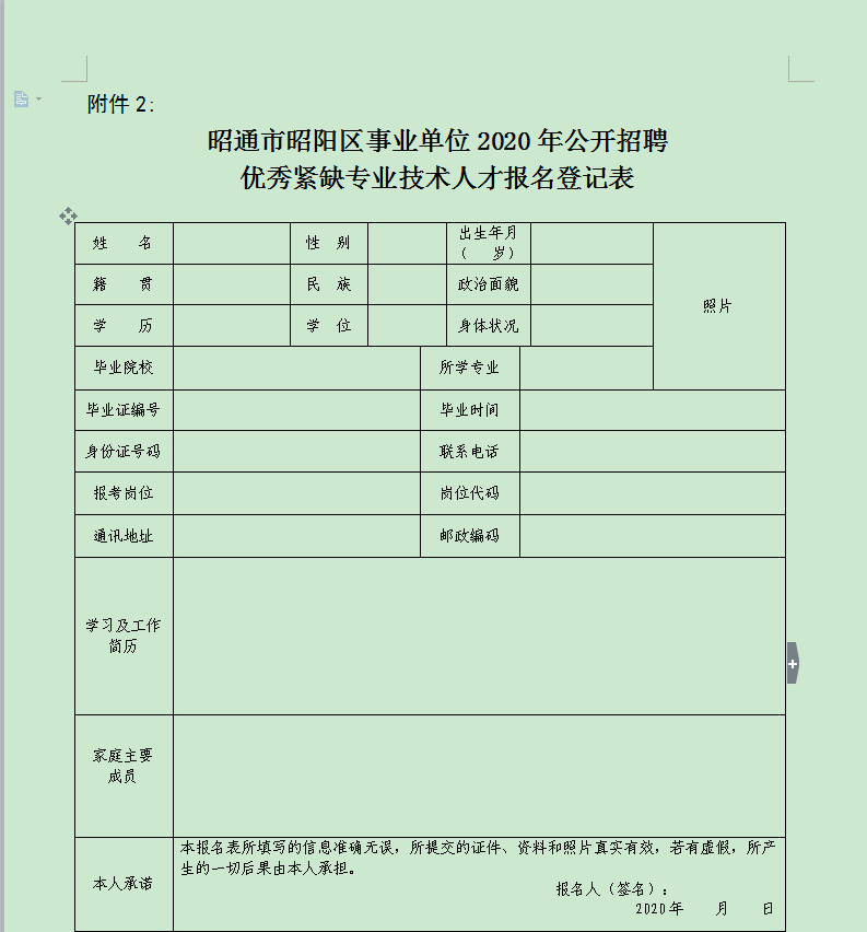 2.昭通市昭陽區(qū)事業(yè)單位2020年公開招聘優(yōu)秀緊缺專業(yè)技術(shù)人才報名登記表