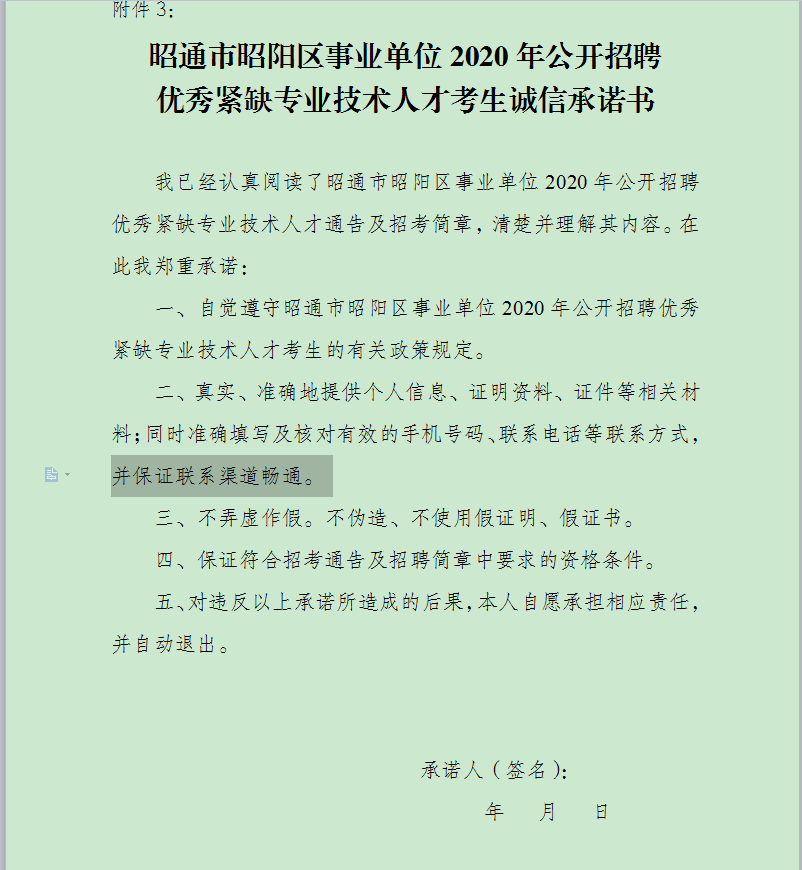 3.昭通市昭陽區(qū)事業(yè)單位2020年公開招聘優(yōu)秀緊缺專業(yè)技術(shù)人才考生誠信承諾書
