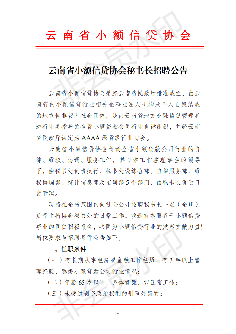 云南省小額信貸協(xié)會(huì)秘書(shū)長(zhǎng)招聘公告