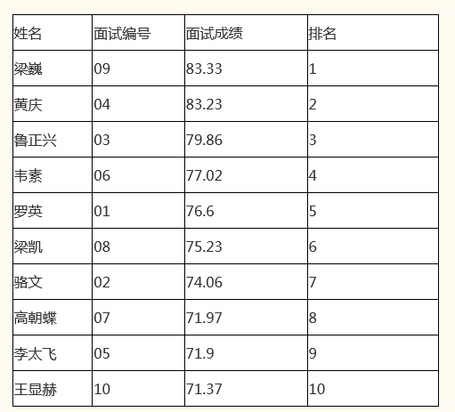 蚌峨鄉(xiāng)人民政府購買扶貧辦社會服務(wù)崗位人員面試已于2020年5月6日結(jié)束,根據(jù)招聘程序,現(xiàn)將面試成績公告如下: