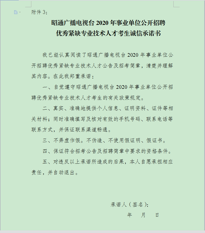 3.昭通廣播電視臺2020年事業(yè)單位公開招聘優(yōu)秀緊缺專業(yè)技術(shù)人才考生誠信承諾書