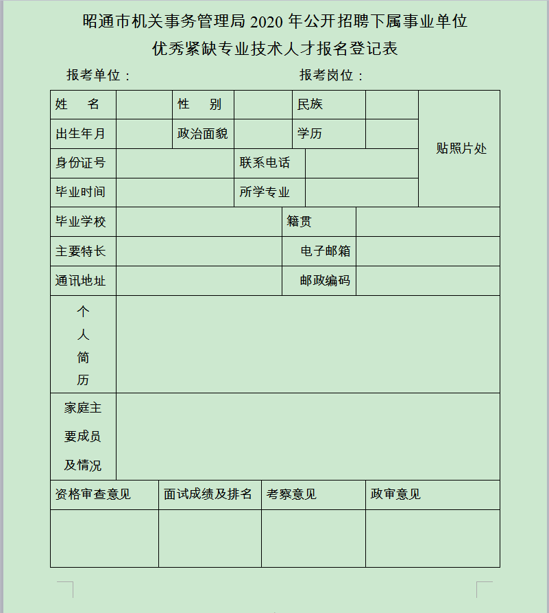 2. 昭通市機關(guān)事務(wù)管理局2020年公開招聘下屬事業(yè)單位優(yōu)秀緊缺專業(yè)技術(shù)人才報名登記表;