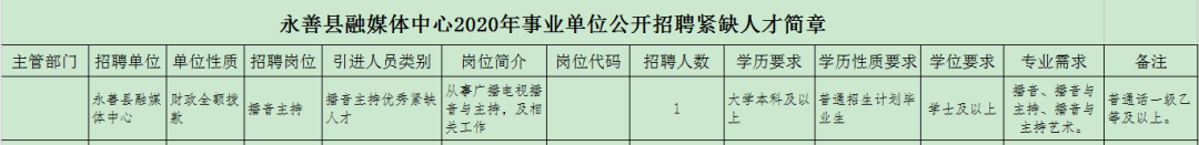永善縣融媒體中心招聘人數(shù)1名(播音主持)。招聘崗位詳見昭通市永善縣2020年公開招聘優(yōu)秀緊缺人才簡章(附件1)。